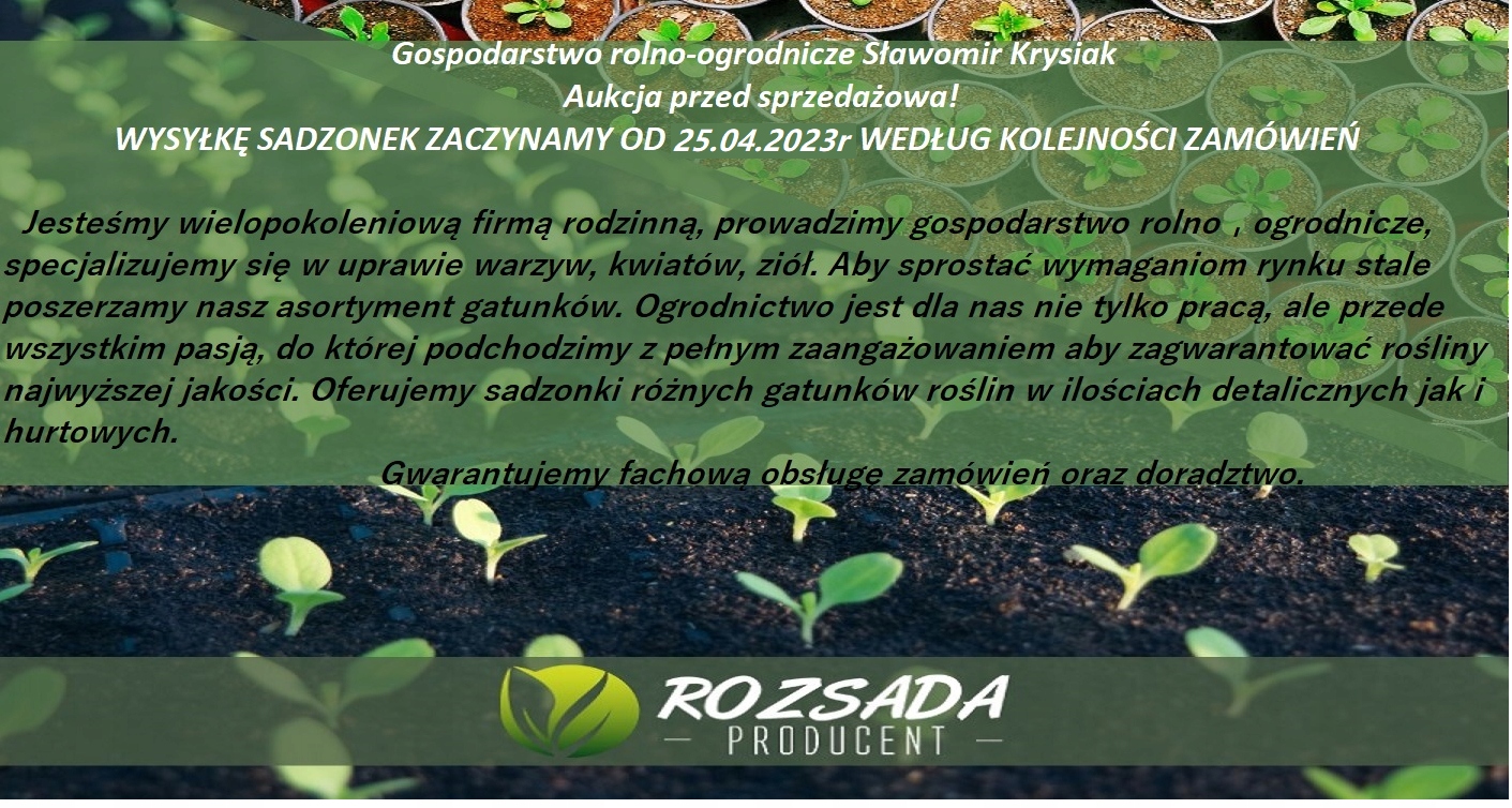 Jesteśmy wielopokoleniową firmą rodzinną, prowadzimy gospodarstwo rolno-ogrodnicze, specjalizujemy się w uprawie warzyw, kwiatów, ziół. Aby sprostać wymaganiom rynku stale poszerzamy nasz asortyment gatunków. Ogrodnictwo jest dla nas nie tylko pracą, ale przede wszystkim pasją, do której podchodzimy z pełnym zaangażowaniem, aby zagwarantować rośliny najwyższej jakości. Oferujemy sadzonki różnych gatunków roślin w ilościach detalicznych, jak i hurtowych. Gwarantujemy fachową obsługę zamówień oraz doradztwo.